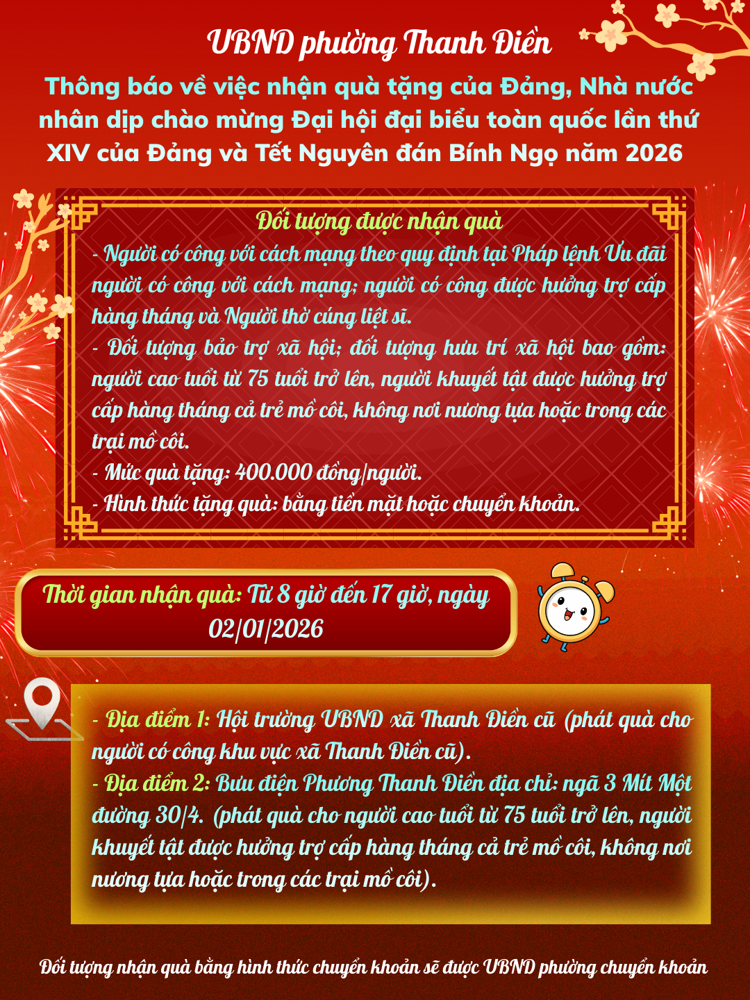 ỦY BAN NHÂN DÂN PHƯỜNG THANH ĐIỀN THÔNG BÁO Về việc nhận quà tặng của Đảng, Nhà nước nhân dịp chào mừng Đại hội đại biểu toàn quốc lần thứ XIV của Đảng và Tết Nguyên đán Bính Ngọ năm 2026